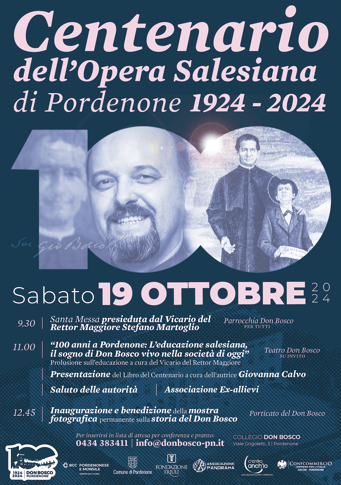Al Teatro Don Bosco (evento su invito), il Vicario del Rettor Maggiore terrà una prolusione dal titolo: “100 anni a Pordenone: l’educazione salesiana, il sogno di Don Bosco vivo nella società di oggi”. A seguire, Giovanna Calvo presenterà il Libro del Centenario, un'opera che racconta la storia e l'evoluzione della presenza salesiana a Pordenone.
