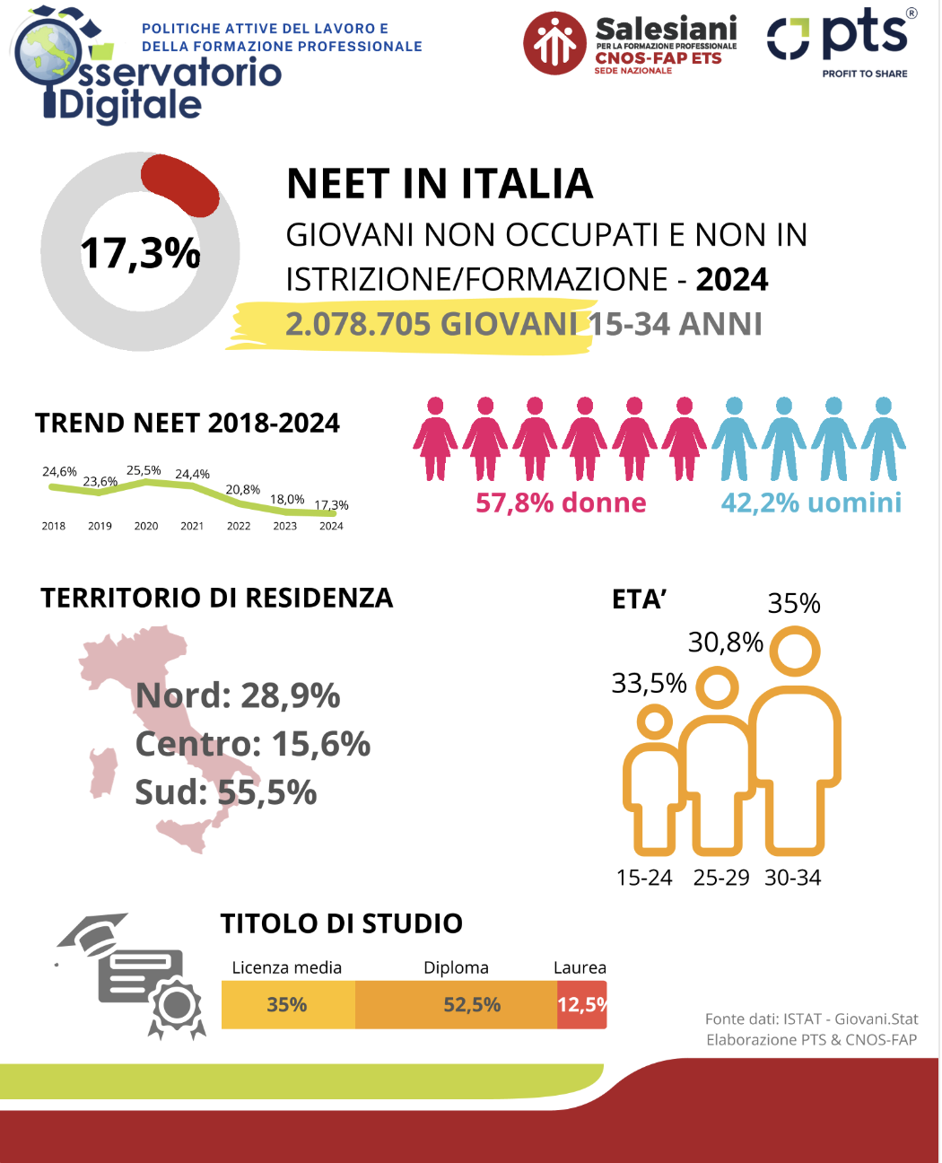 Il 57,8% dei NEET sono donne, evidenziando una persistente disuguaglianza di genere.